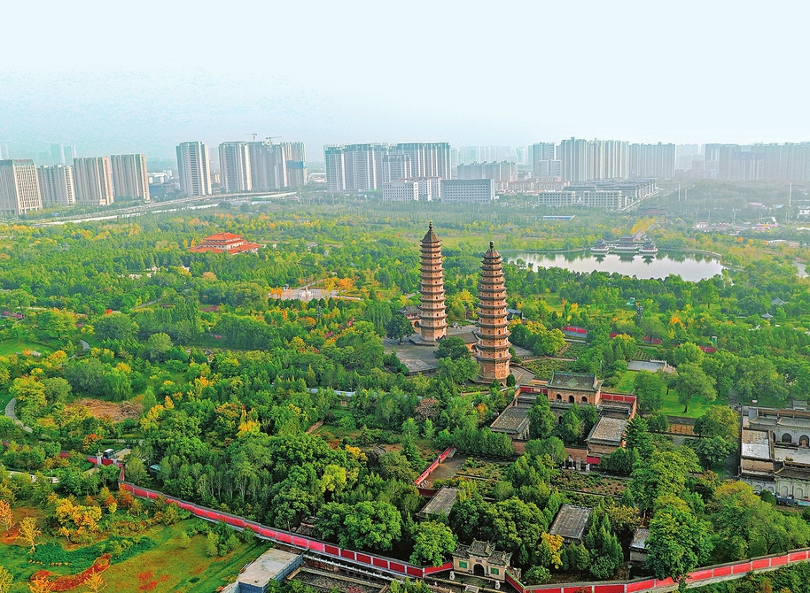 层林尽染处 双塔入画来