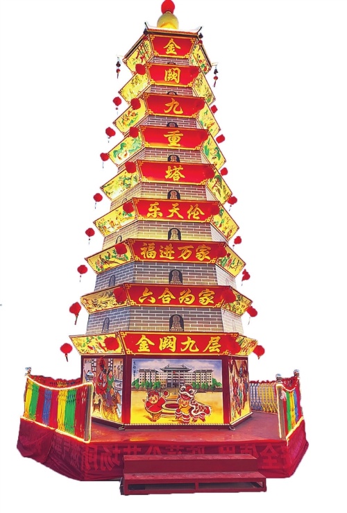 “老架火”的制作工艺处处彰显着匠心精神。匠人们一般在节日庆典三天前就开始布置架子,每层分东、南、西三面,以纸和高粱秆为材,精心扎制出亭台楼阁的造型,按照旺火、牌楼火、架火、瀑布火的顺序依次悬挂。架火的层数严格遵循农历月份,平年十二层,闰年十三层。从底座的“宝华阁”到顶端的“火神庙”,每一层都凝聚着匠人的智慧与心血。刘二元回忆,早年架身上多绘制《西游记》中的经典场景,随着时代变迁,逐渐转为天龙山、晋祠等本地名胜,细腻的笔触勾勒出“龙凤呈祥”等吉祥图案,寄托着人们对美好生活的深切向往。