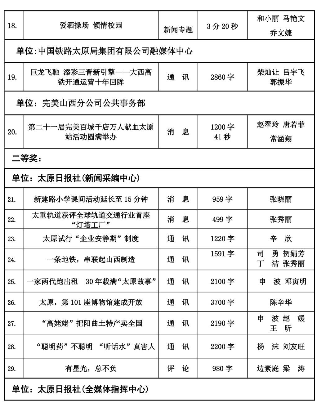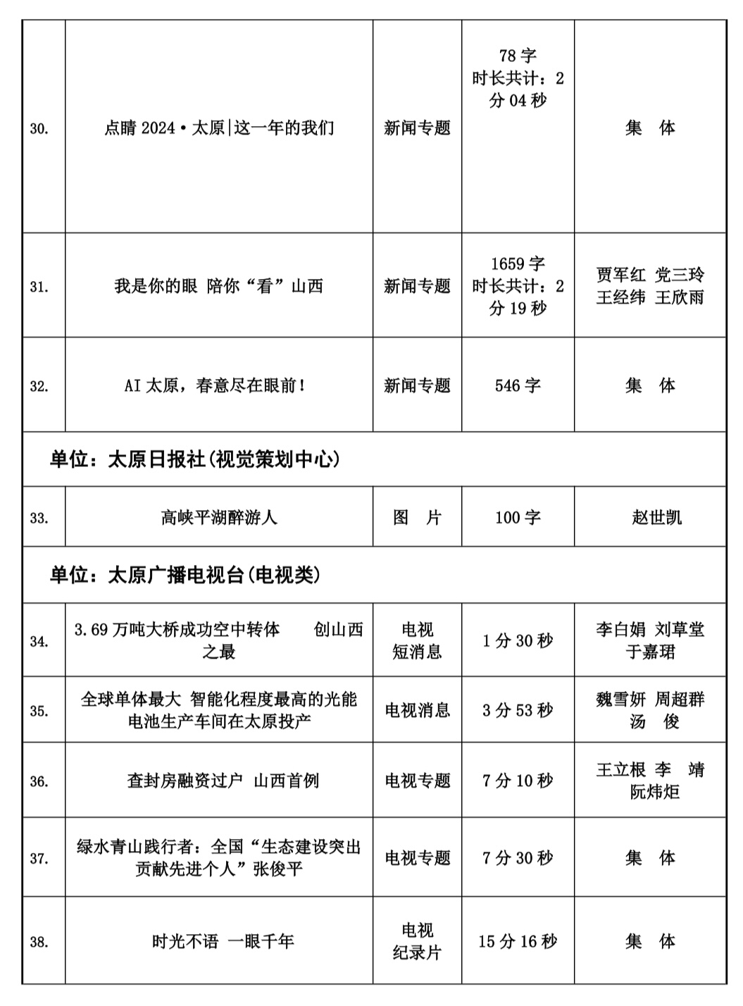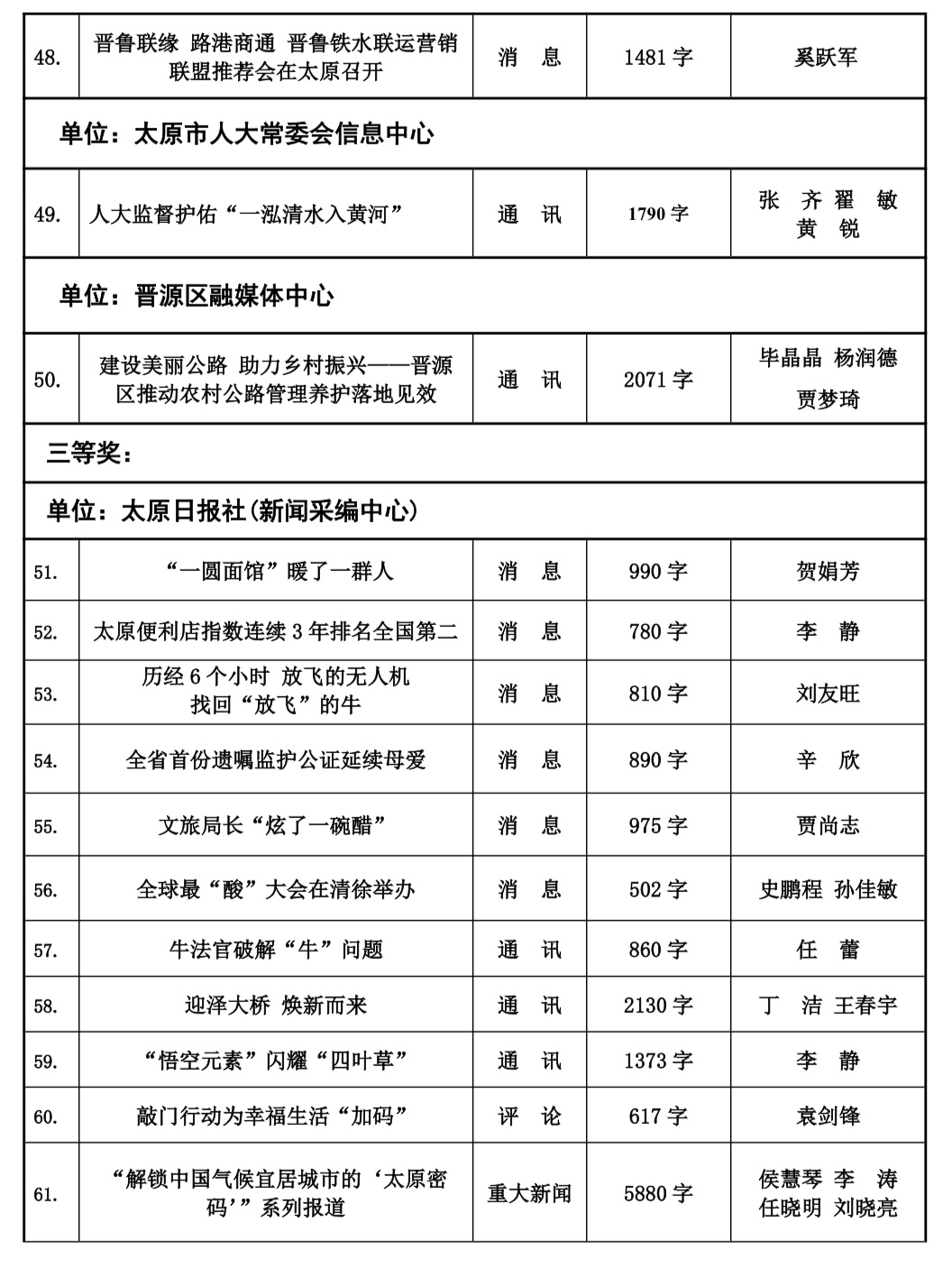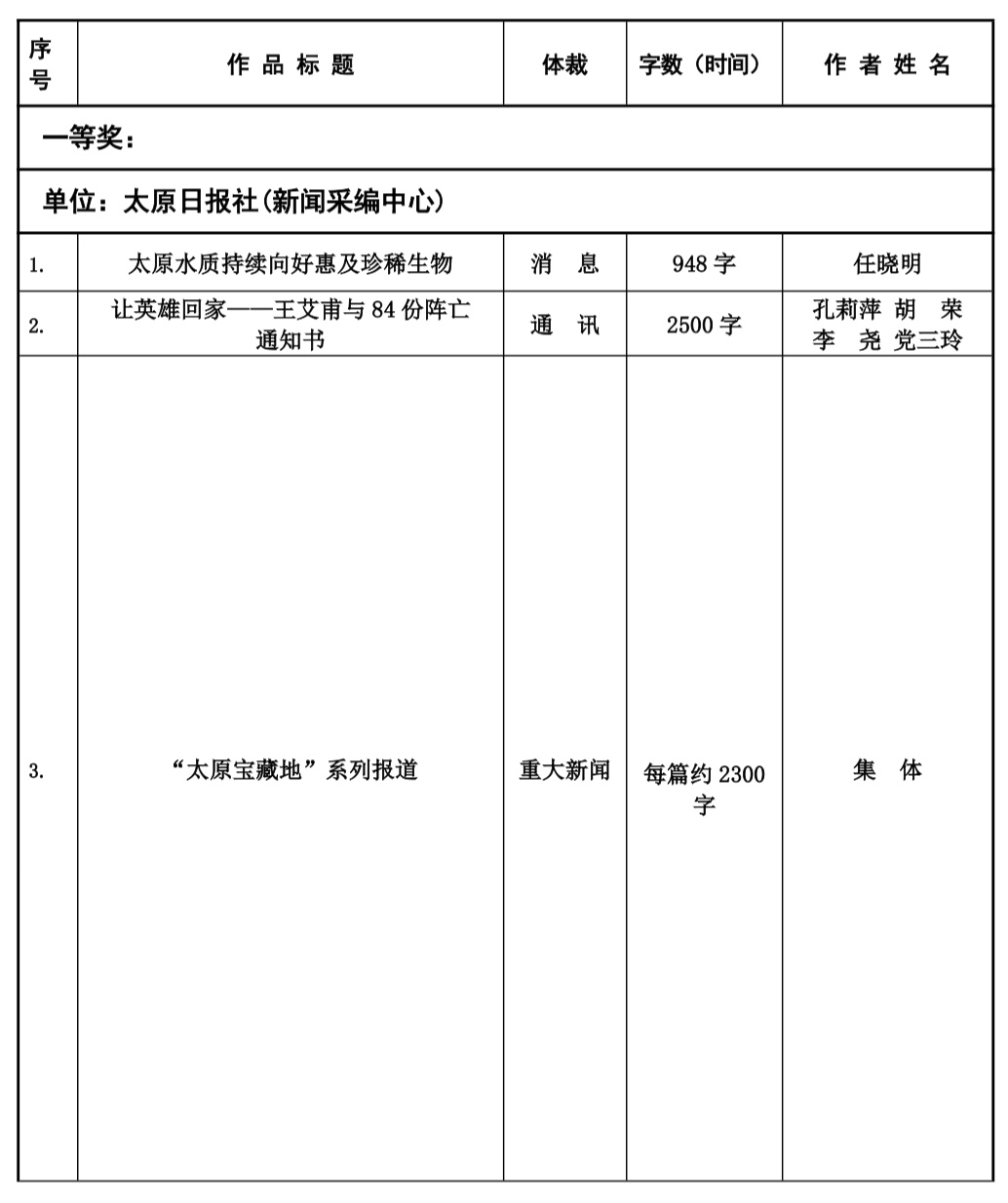 本届太原新闻奖评选工作自今年2月份正式下发评奖文件以来,全市各会员单位认真组织评选,经单位推荐以及自我推荐,于四月中旬陆续收到各会员单位报送参评作品总计125件。市记协严格按照程序,共评选出100件入围作品,并于10月20日,组织专家评委对100件入围作品最终定评,产生一等奖20件,二等奖30件,三等奖50件,现予公示。公示时间为五个工作日,如有问题,可来电、来函反映。太原市新闻工作者协会地址:新建路78号新闻大厦4层,联系人:乔亚军,电话:15235375197。