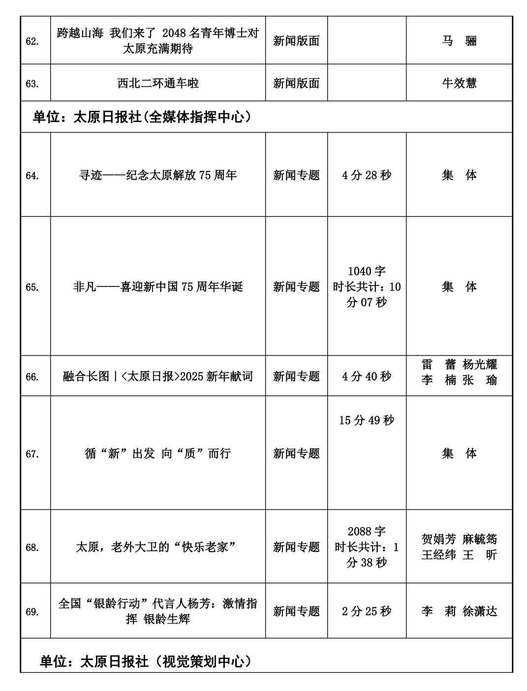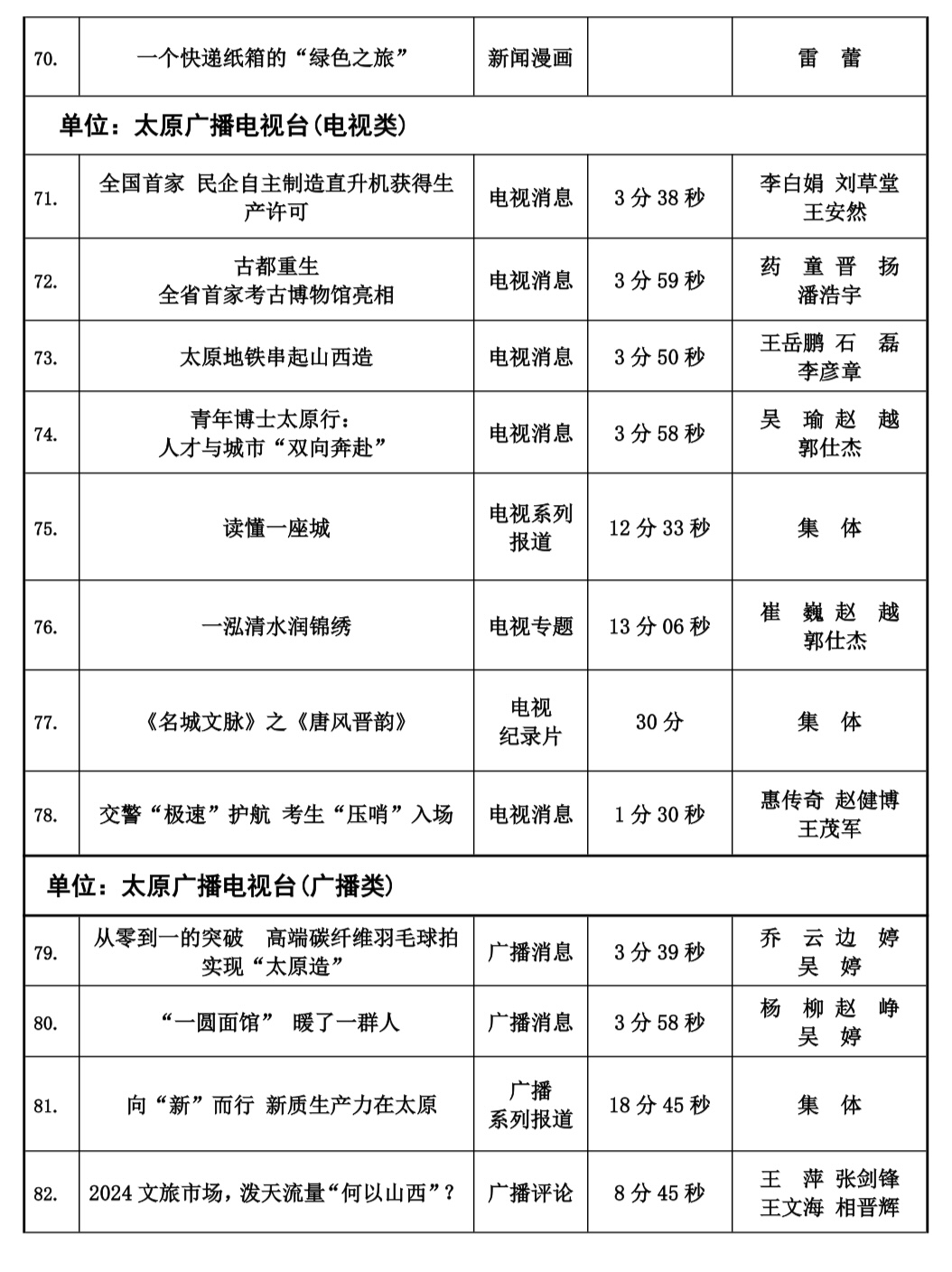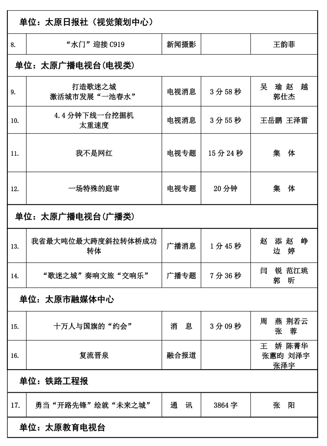 本届太原新闻奖评选工作自今年2月份正式下发评奖文件以来,全市各会员单位认真组织评选,经单位推荐以及自我推荐,于四月中旬陆续收到各会员单位报送参评作品总计125件。市记协严格按照程序,共评选出100件入围作品,并于10月20日,组织专家评委对100件入围作品最终定评,产生一等奖20件,二等奖30件,三等奖50件,现予公示。公示时间为五个工作日,如有问题,可来电、来函反映。太原市新闻工作者协会地址:新建路78号新闻大厦4层,联系人:乔亚军,电话:15235375197。
