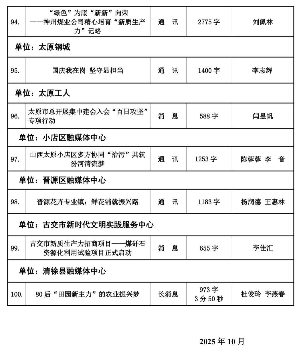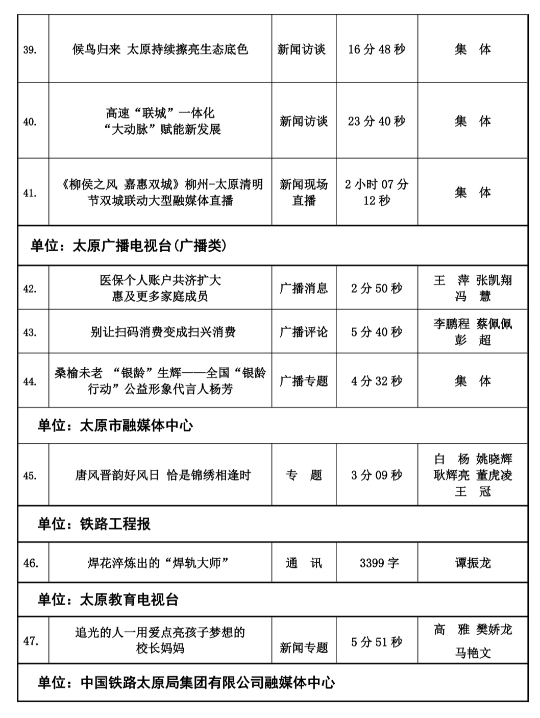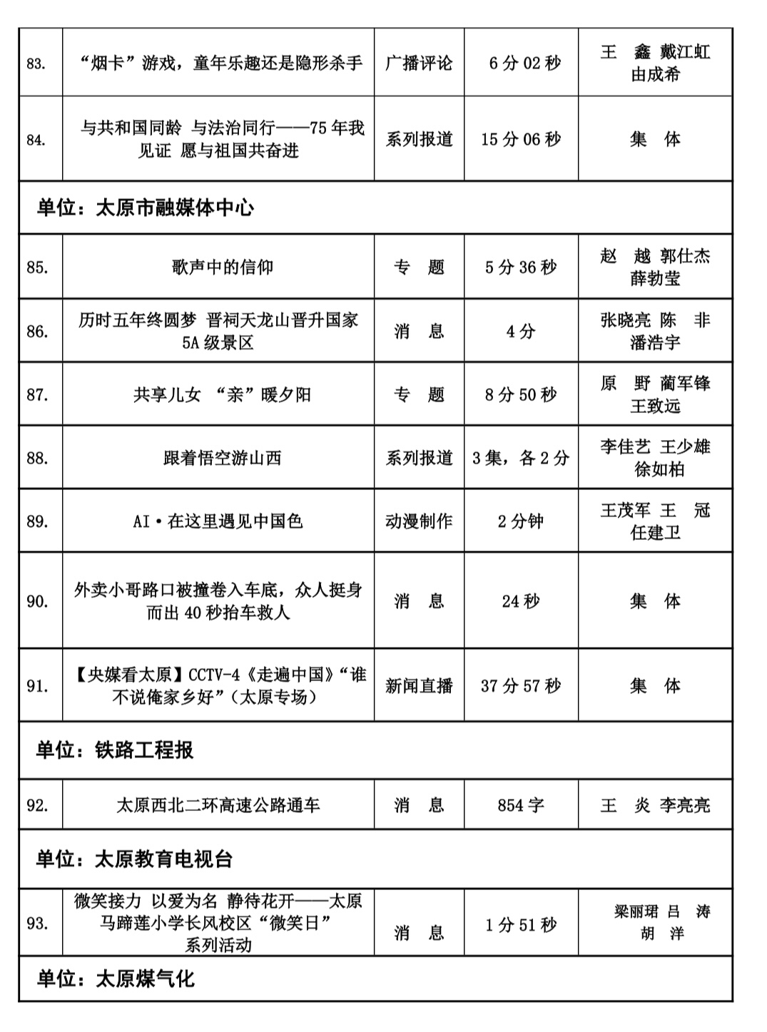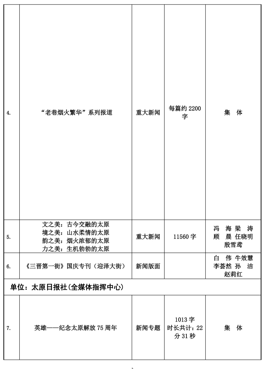 本届太原新闻奖评选工作自今年2月份正式下发评奖文件以来,全市各会员单位认真组织评选,经单位推荐以及自我推荐,于四月中旬陆续收到各会员单位报送参评作品总计125件。市记协严格按照程序,共评选出100件入围作品,并于10月20日,组织专家评委对100件入围作品最终定评,产生一等奖20件,二等奖30件,三等奖50件,现予公示。公示时间为五个工作日,如有问题,可来电、来函反映。太原市新闻工作者协会地址:新建路78号新闻大厦4层,联系人:乔亚军,电话:15235375197。
