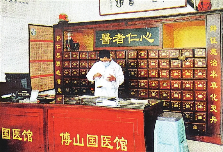 傅山国医馆工作人员正在抓药