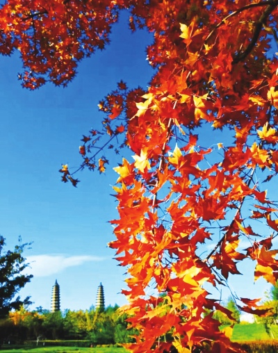 进入11月,双塔公园的五角枫,悄然褪去盛夏的翠绿,叶片由浅黄渐染成艳红,似火焰跳跃在枝头,将千年双塔的古朴与秋的热烈完美交融。刘晓亮 摄
