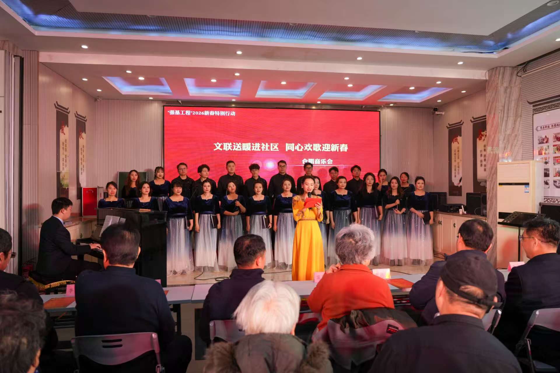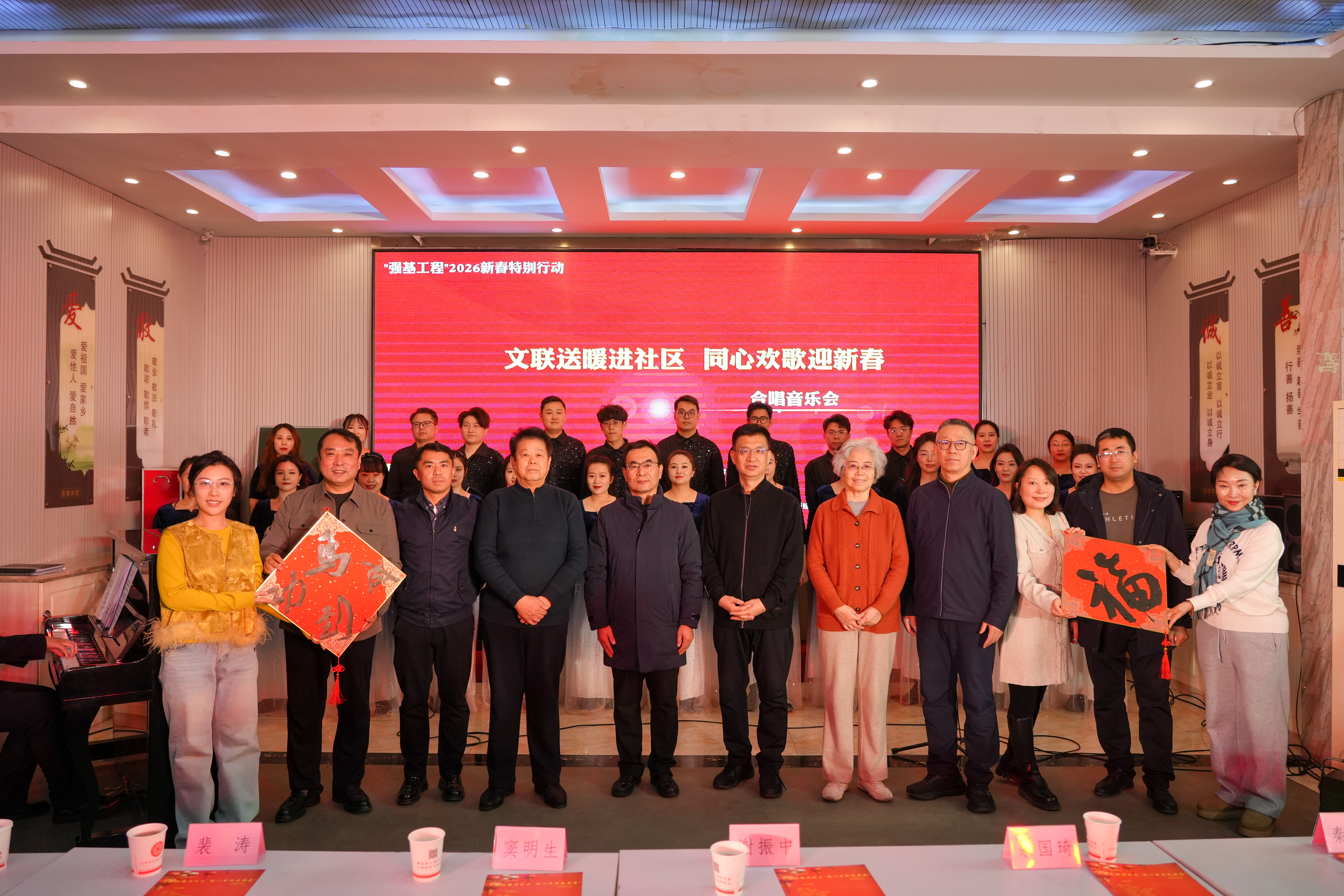 新春将至,暖意氤氲,年味渐浓。1月15日下午,“文联送暖进社区,同心欢歌迎新春”——山西“强基工程”2026特别行动合唱音乐会,在太原市老军营街道新建南路第二社区温情开演,为社区居民送上了一场年味十足、暖意满满的文化盛宴。本次活动由山西省文学艺术界联合会指导,省电影家协会、省电视艺术家协会、省音乐家协会、省书法家协会、省文化艺术传媒中心、省艺术创作研究中心及老军营街道新建南路第二社区联合主办。省文联党组成员、副主席谢振中,原山西省直工委副书记、省文艺评论家协会副主席、一级巡视员余国琦,原山西省文旅厅副厅长、省剧协主席窦明生,太原市迎泽区委常委、老军营街道党工委书记裴涛,太原市迎泽区人大副主任秦宇星,省文联副主席、省艺术创作研究中心党支部书记王小东,省电视艺术家协会副主席兼秘书长谭雯霞等嘉宾出席活动,与数百名社区居民欢聚一堂,在婉转歌声与浓浓墨香中,共叙邻里温情,共迎新春佳节,共话幸福生活。