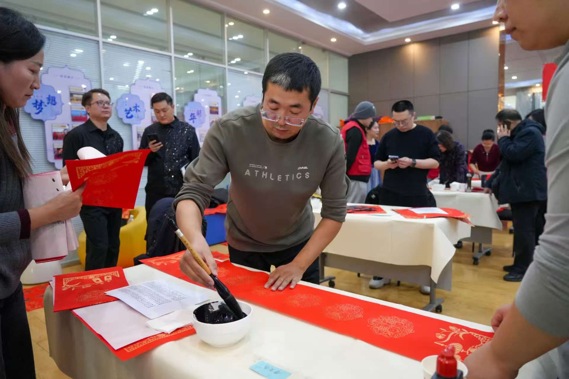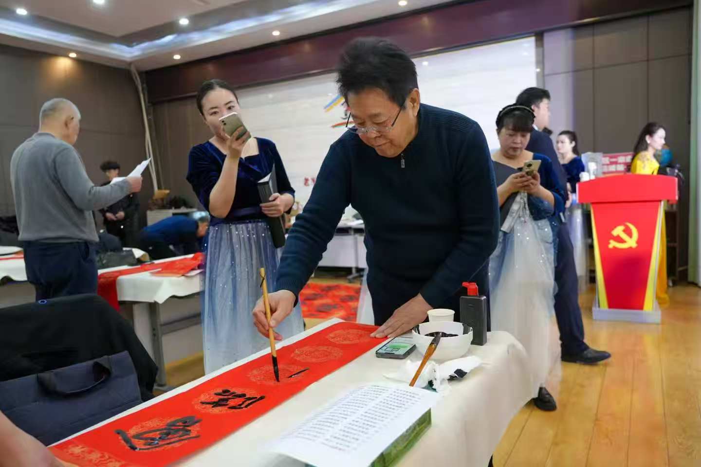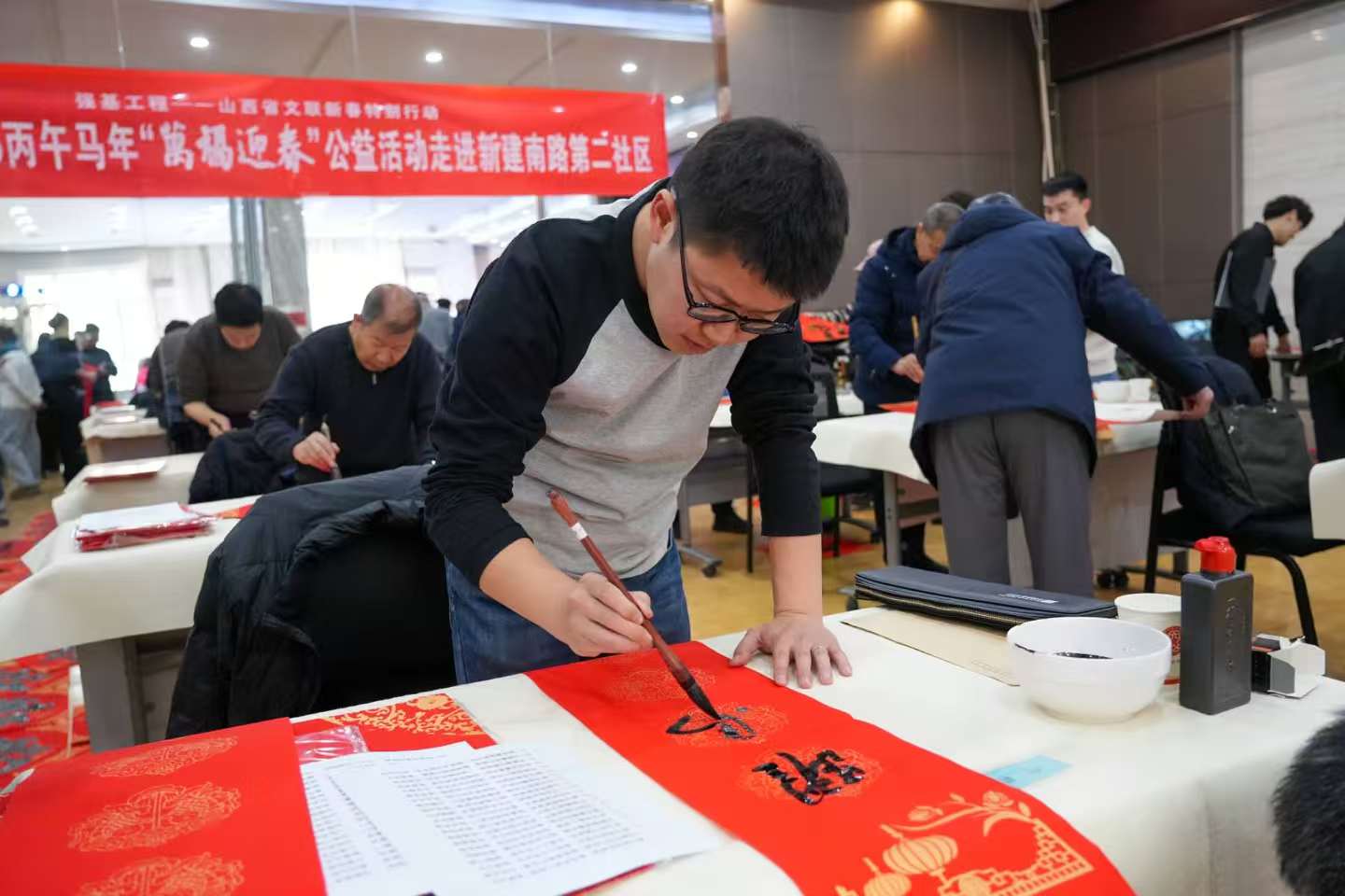 舞台另一侧,书画惠民活动同样热闹非凡。王国柱、李亚杰、何聪、温鹏飞、王京毅、张丽、李占福、王富魁、陈晋斌、孟森林、郑宪萍等多位书画名家齐聚一堂,铺展对联宣纸,饱蘸浓墨,凝神挥毫。一幅幅对仗工整、寓意吉祥的春联,一个个遒劲洒脱、饱含祝福的“福”字跃然纸上,承载着辞旧迎新、平安喜乐的美好祈愿。社区居民们有序排队、争相求取,脸上洋溢着幸福笑容,现场欢声笑语不断,暖意涌动,年味愈发浓厚。书法家们还根据居民需求即兴创作书画作品,将最真挚的新春祝福传递到每一位群众心中,让中华优秀传统文化在基层落地生根、开花结果。