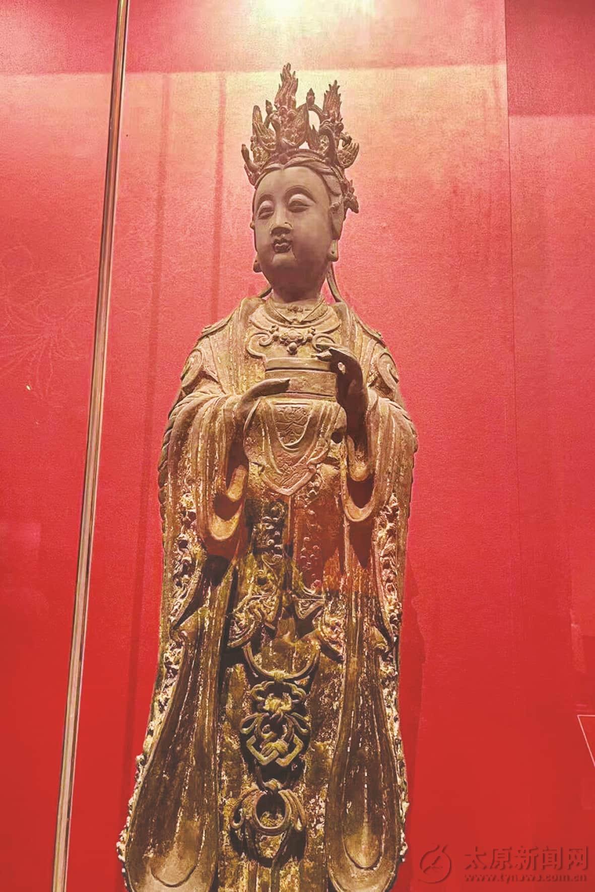 在“真容远拂”展区,我看到展柜中有一对组合塑像,就是我们口耳相传的周公与桃花女。雕塑青铜鎏金,周公气质睿智沉稳;头戴宝冠,身着圆领袍服,脚穿云头履,面容丰润,眼细长,双目半睁;右手掌心朝左置于胸前,左手捧书册。桃花女体态丰腴而不臃肿,气质端庄聪慧灵动;头戴凤冠,面容丰润饱满,细眉凤目;肩披四合如意式云肩,搭配绶带等装饰,脚穿翘尖履;双手捧有长方形宝盒。它们衣纹褶皱流畅自然,神情刻画栩栩如生,既符合雕塑形神兼备的艺术追求,又诠释了宗教造像飘逸超凡的神韵特质。