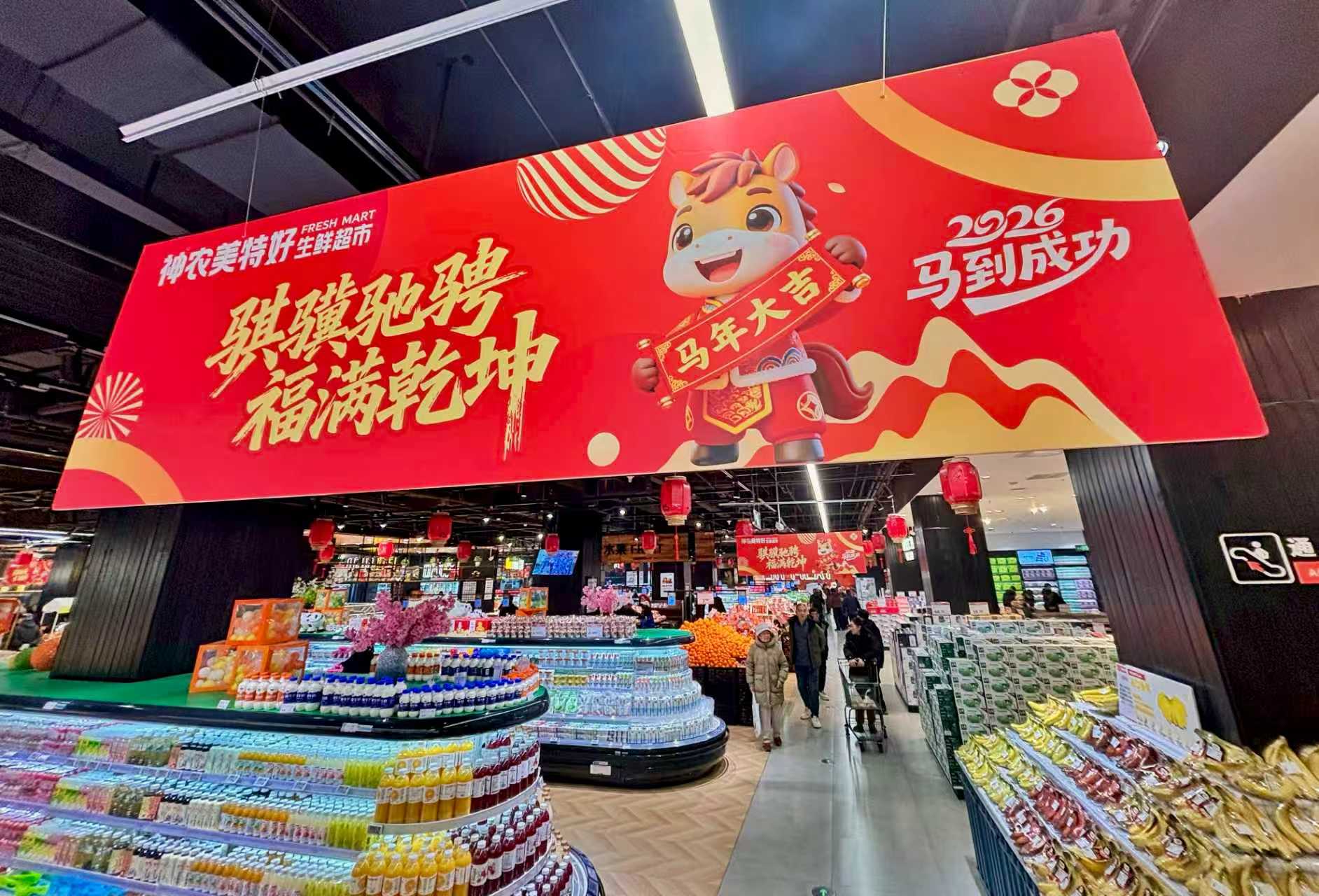 1月26日,省城神农美特好超市(凯旋街店)内,“马”元素装饰十分抢眼。随着春节的脚步临近,节日氛围逐渐升温。邓寅明 摄