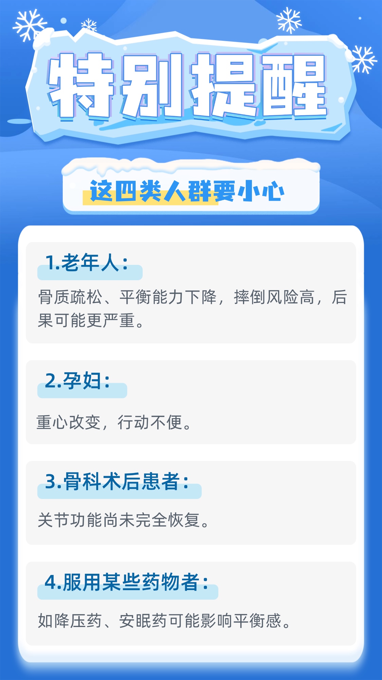 近日寒潮来袭,雨雪低温导致路面湿滑,极易引发摔跤。每年冬雪季,因路滑摔倒导致骨折、扭伤的患者都会明显增多。人民网《健康“医”点通》栏目采访了河南省职工医院中医科·中西医结合科主任医师张恒,总结了一份“雪天防摔秘籍”,助您安稳过冬!