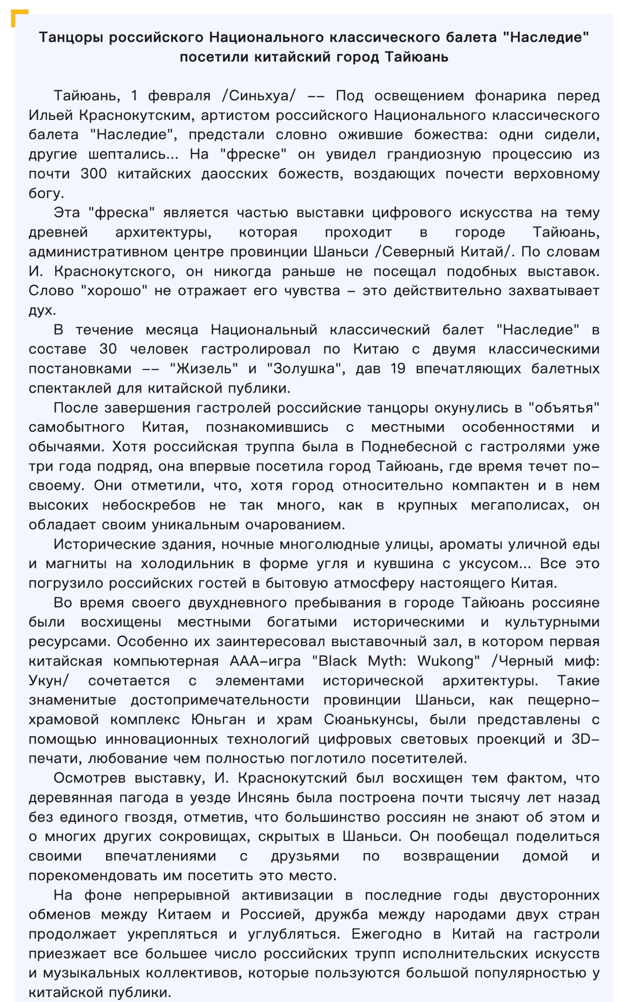 此外,本次俄罗斯舞蹈艺术家太原行,还前往北齐壁画博物馆、钟楼街等太原市文化地标。俄罗斯国家古典传承芭蕾舞剧院成立于1979年,该团拥有20多名国际芭蕾比赛获奖演员,曾出访过德国、英国、美国、墨西哥、印度、西班牙等国家和地区。