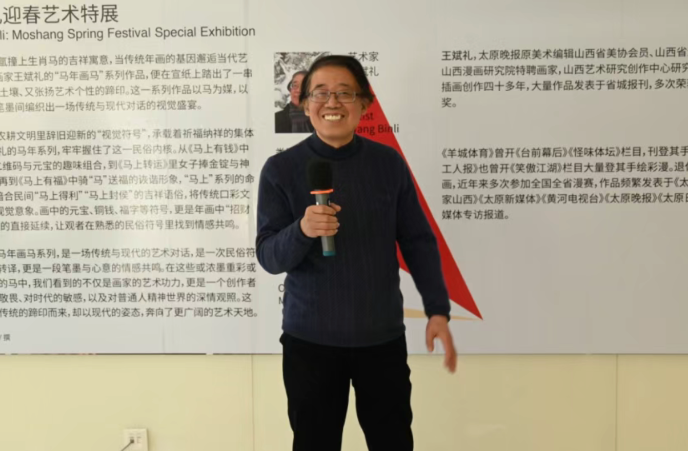 王斌礼可谓传媒老骥伏枥,艺术壮心不已。作为《太原晚报》的原美术编辑,创作插画四十余年,不仅在省城媒体发表了海量艺术作品,还应邀在《羊城体育》《天津工人报》等开设栏目,刊登了大量手绘彩漫。退休后,他艺心如初,笔耕不辍,专攻水墨漫画。本次“马年画马”展览,就是他在马年将临之际的近一个月内,专心创作贡献给受众的新作。