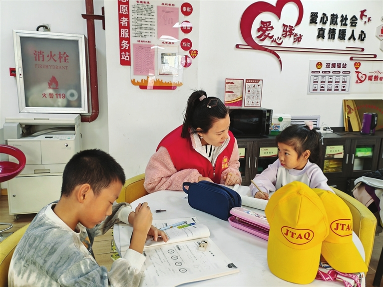 当日,社区网格员蒋江红接到辖区居民陈先生的紧急求助,因家中临时有事,无法照看孩子,希望社区临时帮忙照看。蒋江红接到求助后,立即将孩子接到社区青少年活动专区。作为一名“资深宝妈”,蒋江红充分发挥育儿经验,耐心安抚两名孩子的情绪,细心陪伴、轻声引导,帮助孩子们顺利进入学习状态,安心完成作业。在托管过程中,她还主动辅导功课,让孩子在社区也能感受到家一般的温暖。
