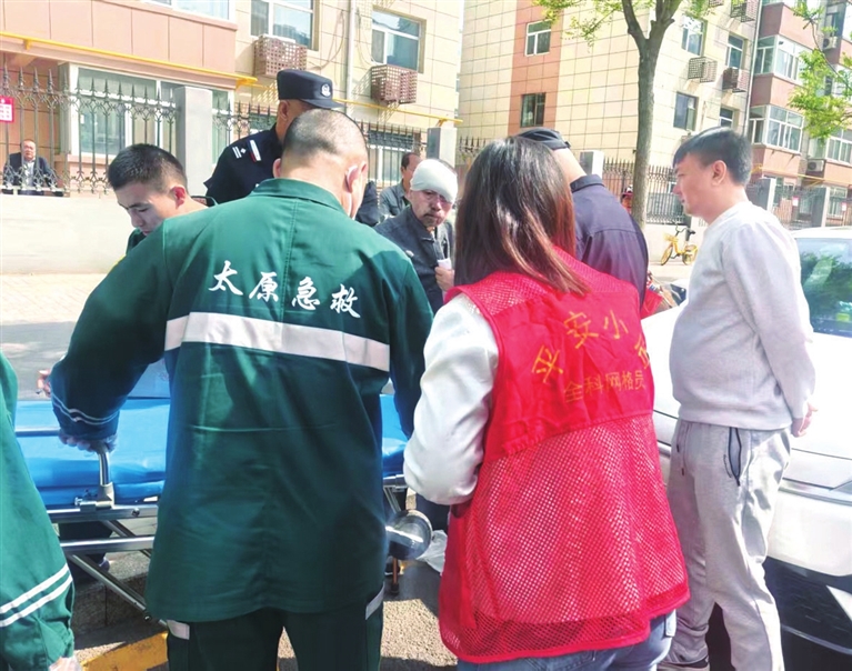当天上午,社区网格员王艳萍日常巡查时,发现辖区王村南街路边有老人摔倒,头部被磕破流血不止。现场120医护人员已为老人包扎伤口,但因无法联系上家属,一时无法送医。见情况紧急,王艳萍当即联系同事李锐锐和陈娟赶至现场。王艳萍安抚老人并查看其身体状况,李锐锐和陈娟拨打110报警。经了解,老人是社区大唐花园居民,外出散步时突然出现头晕、腿软,导致摔倒。