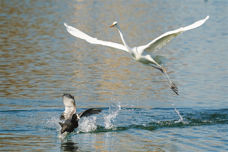 白鹭在太原汾河湿地公园觅食